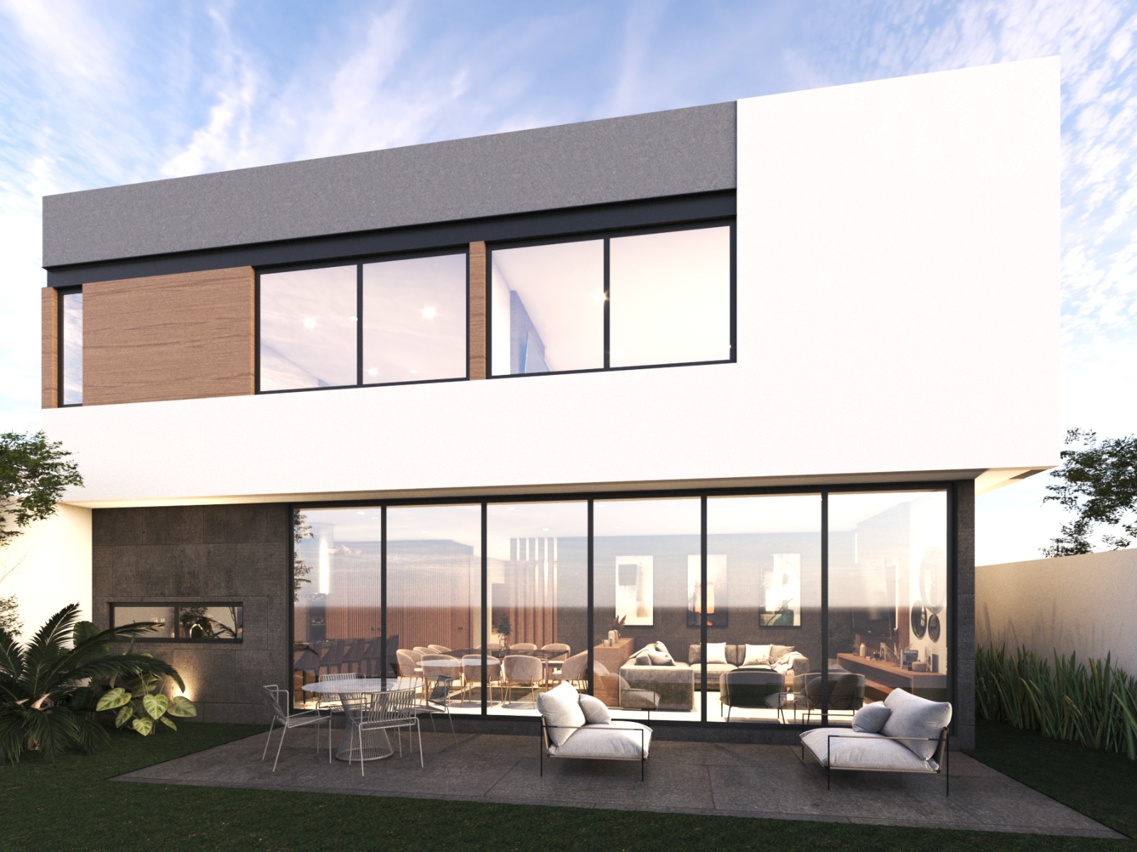 Fachada minimalista con ventanas hacia los costados para mayor privacidad.